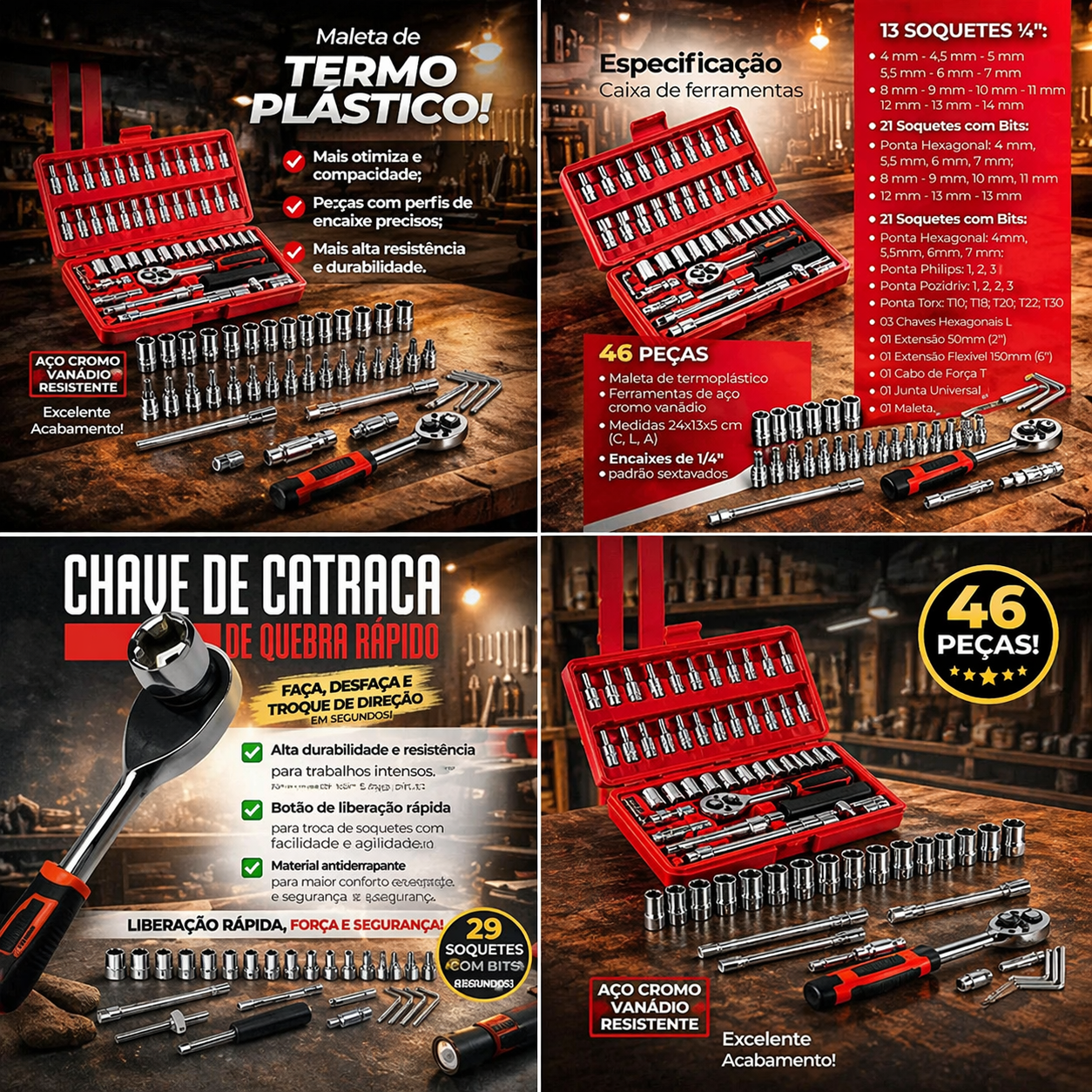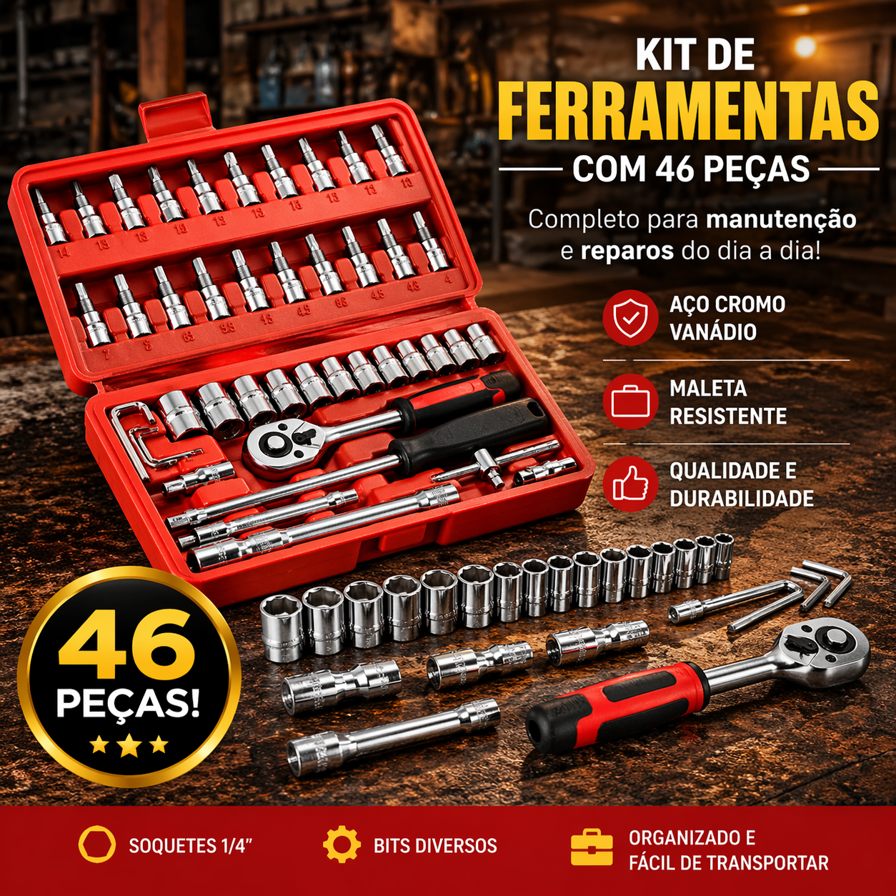 Kit Chaves Ferramentas Jogo Fenda Philips Catraca Soquete Allen 46 Peças com Maleta Completa Manual Ideal Mecânico Manutenção Casa Carro Profissional Resistente Portátil Compacto Quicko